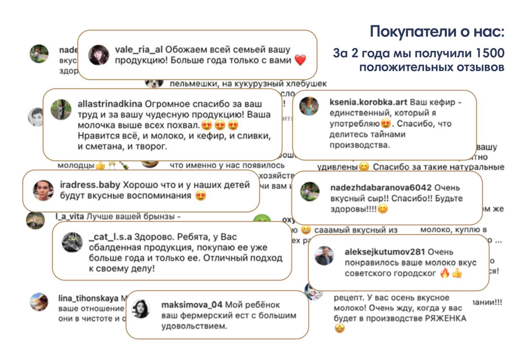 Но давайте честно: мы все устали от поисков колбасы из мяса, настоящего молока, хлеба на живой закваске и десертов без вредных добавок. Поэтому, мы с командой собрали своих: добросовестных фермеров, которые делают честный продукт. Продукт, который можно давать детям, есть самим и быть уверенным, что он пойдёт во благо здоровью семьи.